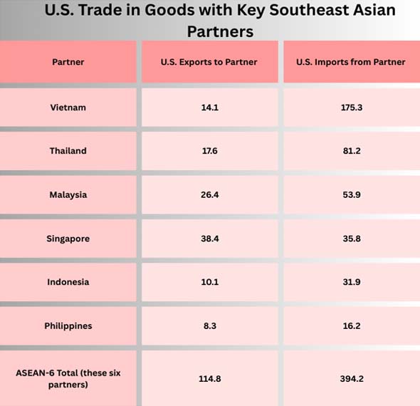 Southeast Asia's position in U.S. trade was already big, and in certain nations, it was even more so from the U.S. point of view. The U.S. Census Bureau's numbers below illustrate how much the U.S. trades goods with six important Southeast Asian partners. Please note that the totals for 2025 are for January through November 2025 (the release for December 2025 was pushed back), therefore they should be read as "2025 YTD (Jan–Nov)."
