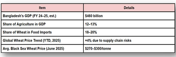South Asia's Bangladesh, a lower-middle-income nation, is one of the biggest importers of wheat worldwide. Every year, it uses around 7–8 million tons of wheat, the majority of which is imported from Canada, Russia, and Ukraine. Bangladesh has frequently experienced wheat supply shocks as a result of shifting global supply chains, logistical difficulties, and fluctuating weather patterns, particularly following the disruption of Black Sea shipments due to the Russia-Ukraine conflict.