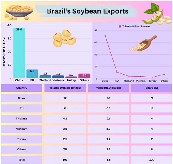 Ans. China is the largest buyer, accounting for about 70% of Brazil’s total soybean exports.