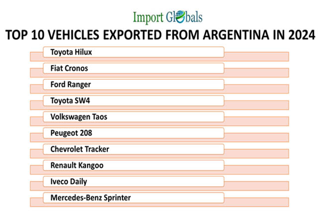 To meet the global demands regarding vehicle import, the country has induced divergent variants of its production in the export services for building the trade gaps with targeted destination estates. According to the Argentina Export Data the top 10 variants of vehicles exported from the nation in 2024 are,