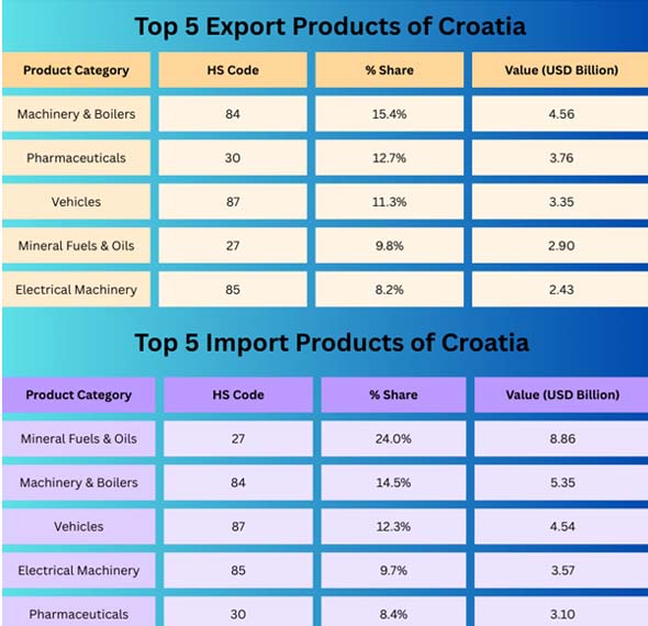 Croatia's trade continued to increase steadily from 2020 to 2024. According to Import Globals' Croatia Import Export Trade Data, exports went up by more than $10 billion, and imports went up by more than $13 billion. This is because of the growing demand for energy and technology. The growing trade imbalance shows how much Croatia relies on imported energy, while expanding exports demonstrate that the country is strong in medicines, equipment, and processed commodities.