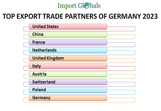 Similar to the import trade rate, the export businesses of Germany are also thriving in a global manner which is boosting the global trade rank of the nation. The attributing factors together have recorded a GDP of 4.5 trillion US dollars in 2023 accompanied by an export trade value of 1.89 trillion US dollars; a significant growth than that of 2022 and 2021 i.e. 1.67 and 1.58 trillion US dollars. The export traders facilitating the export businesses of the nation are (the United States– 220 billion US dollars), (China – 138 billion US dollars), (France – 100 billion US dollars), (The Netherlands – 90 billion US dollars), and (The United Kingdom – 80 billion US dollars)