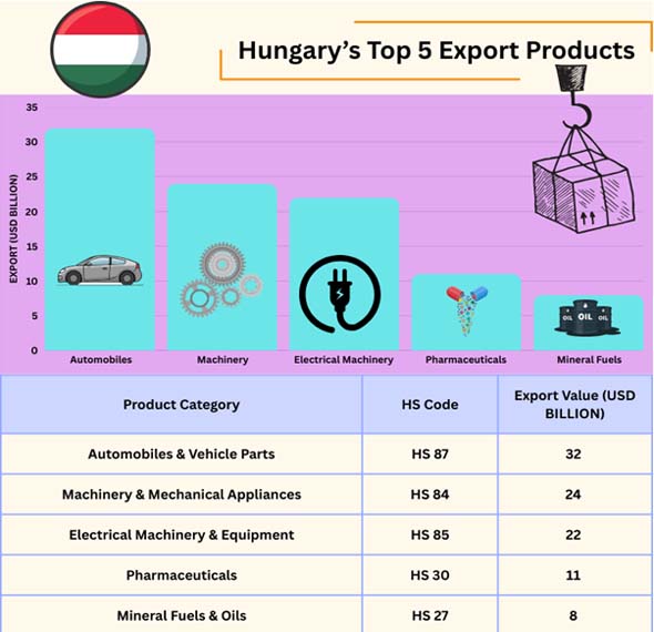 Most of Hungary's exports are industrial, which indicates how good the country is at creating goods, how skilled its people are, and how effectively it fits into European supply systems. Import Globals' Hungary Import Export Trade Data says that the top five export categories account for more than 60% of all products sent out of the country. This means that the economy is focused on high-value industrial commodities. Let's take a closer look at each category.