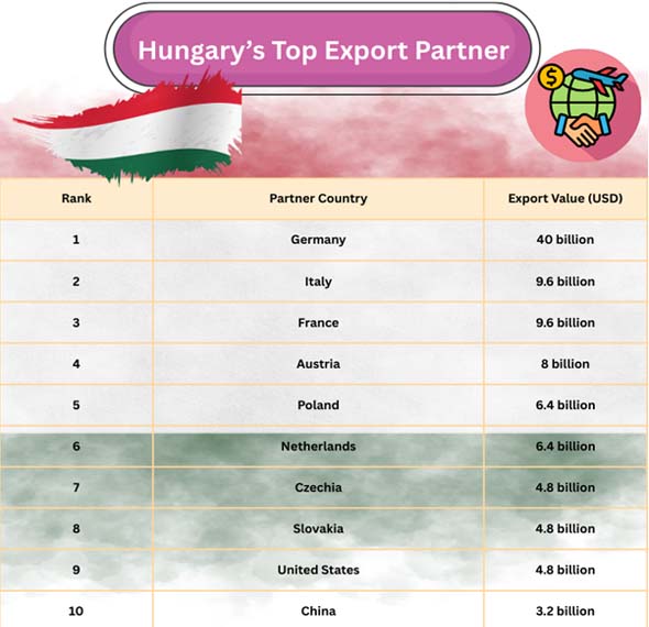 Ans. Germany is Hungary's most crucial trade partner. Germany gets almost a quarter of Hungary's exports.