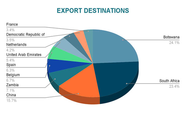 Ans. Namibia exports primarily to Botswana, South Africa, China, Zambia, Belgium, and Spain. These countries account for the majority of Namibia’s export revenue, with diamonds and fish being key traded commodities.