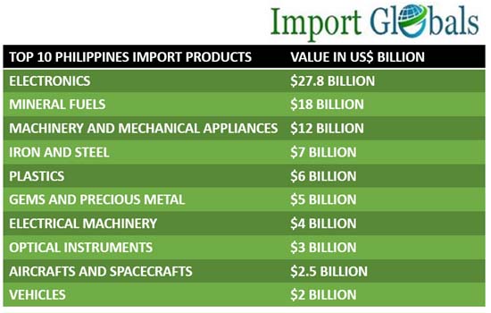 Ans. The top imported products by Philippines are Mobiles Phones, Computers, Mineral Fuel