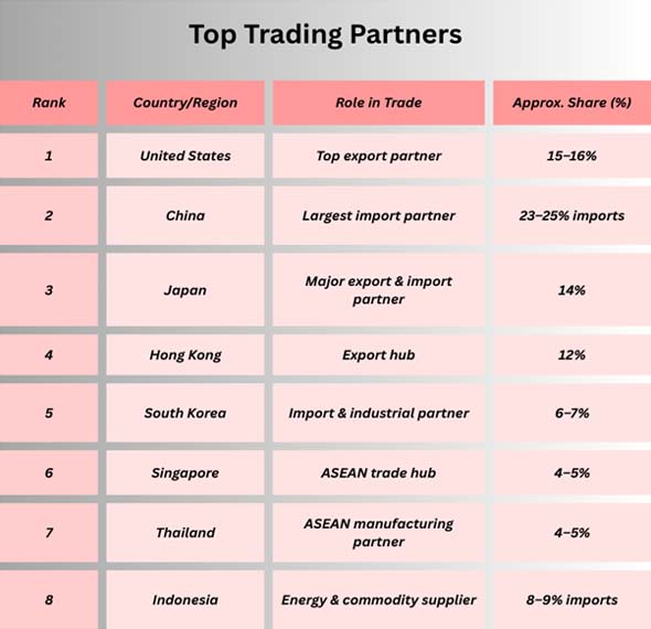 The Philippines' most major commercial partner is China, which is also a key part of its manufacturing supply chain. It makes up about 23–25% of all imports, which shows that it is quite necessary for manufacturers to make items.