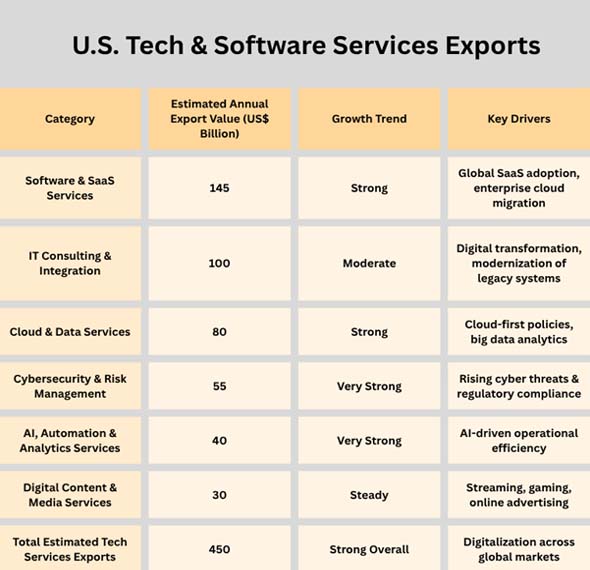 America's leadership in digital innovation around the world has turned IT and software services into one of its most important exports. The U.S. has a huge part of the world's digital trade, including cloud platforms, cybersecurity solutions, enterprise software, and digital consultancy. As per USA Export Data by Import Globals, this "silent engine" adds billions to the U.S. trade surplus and makes the U.S. a stronger player in setting the global technological agenda.
