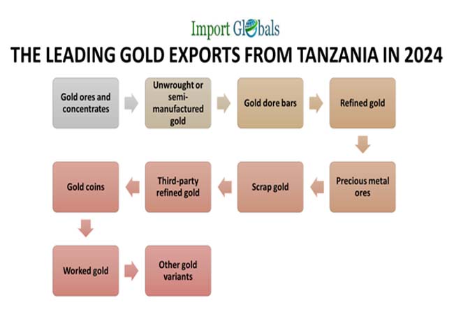 Ans. Gold ores and concentrates are the top exported gold variants from Tanzania in 2024.