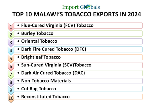 Malawi the leading global producer of tobacco has introduced divergent variants of tobacco in its export market; as a representative of its rich cultural heritage and increasing global demands. As per the Malawi Export Data, the top 10 tobacco exports of the nation in 2024 are,