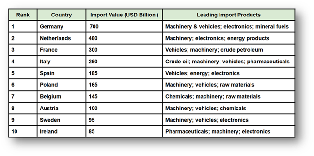 Europe's industrial centers are further connected to surrounding areas by their extensive rail and road networks. Stable cross-border supply chains are guaranteed by robust trade agreements with nations like Norway, Switzerland, and the UK. As per European Importers Data by Import Globals, Europe's economy is resilient, internationally competitive, and closely linked to both its immediate neighbors and international markets due to its advantageous geographic location and strong infrastructure.