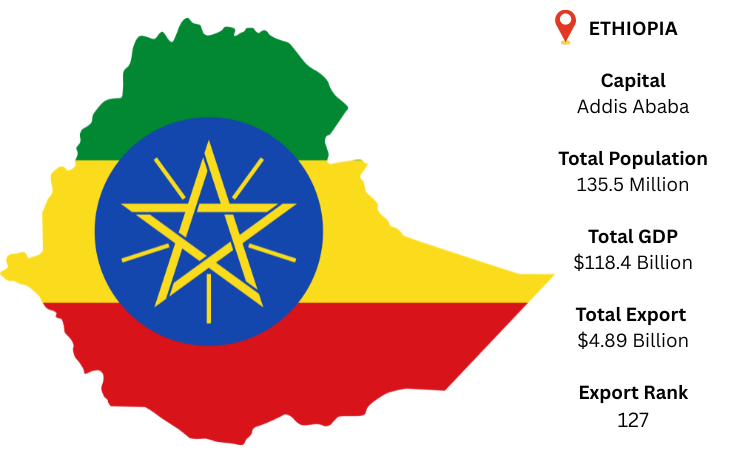Ethiopia is a landlocked country located in the Horn of Africa, sharing borders with Eritrea, Djibouti, Somalia, Kenya, South Sudan, and Sudan. Its capital city, Addis Ababa, serves as the political and commercial hub of the nation. Ethiopia's GDP in 2024 is projected to reach USD 118.4 billion, highlighting its significant role in East Africa’s economic growth. According to global export data, Ethiopia ranks as the 127th-largest exporter in the world. As per the Ethiopia export data, the United States stands as the top importer of Ethiopian goods. Ethiopia’s total export value in 2024 is estimated at USD 4.89 billion, reflecting a rise in agricultural and textile exports. The most exported product by Ethiopia is coffee, which remains the backbone of its foreign exchange earnings.