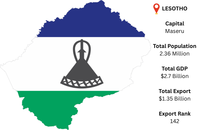 South Africa completely encircles Lesotho, a landlocked nation in Southern Africa. Maseru is its major city and capital. The GDP of the nation is projected to reach USD 2.7 billion in 2024. Global trade data show that Lesotho is the 142nd largest exporter in the world. As per Lesotho export data, Lesotho's main export destination is the United States. According to a combination of sources, Lesotho's overall export value in 2024 is projected to be USD 1.35 billion. Textiles and clothes, especially clothing and accessories, are the nation's leading exports.