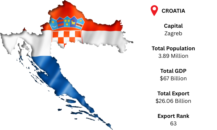 Croatia, an EU nation in Southeast Europe, has a thriving tourism industry in addition to a developing manufacturing and industrial sector. The majority of its economic activity is concentrated in Zagreb, the capital. As per Croatia export data, Croatia, which has a population of around 3.89 million and a GDP of over USD 67 billion (2024 estimated), is ranked 63rd in the world for exports. According to Croatia trade data, its total exports in 2024 totaled USD 26.06 billion. Mineral fuels and oils are Croatia's top product category, and its biggest export destinations are Germany, Italy, and Bosnia & Herzegovina.