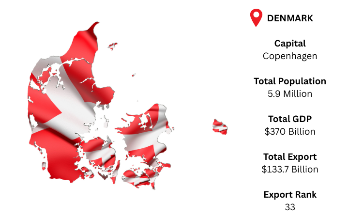 Denmark is a high‑income Nordic economy known for its leadership in pharmaceuticals, machinery, and maritime trade. As per Denmark export data, Copenhagen is the capital, anchoring its global commerce. With a population of 5.9 million and a GDP of around USD 370 billion, Denmark's exports hit USD 133.7 billion in 2024, yielding a healthy trade surplus. Its main export pillars are pharmaceuticals, machinery, and electronics, with strong demand from Germany and Western Europe.