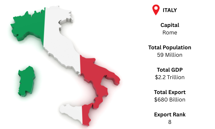 Italy, the manufacturing hub of Europe, is well-known around the world for its luxury products, machines, cars, and fashion. Italy is one of the leading exporters of high-quality industrial and consumer goods worldwide, thanks to its robust export economy. The capital is Rome, while the majority of the nation's exports are driven by Milan and Turin. As per Italy export data, Italy, which has a population of over 59 million and a GDP of almost USD 2.2 trillion, is expected to export roughly USD 680 billion in 2024, demonstrating its strong position as an export-driven European economy.