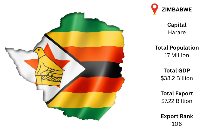 Zimbabwe is a landlocked nation in Southern Africa that shares borders with Botswana, Zambia, Mozambique, and South Africa. Harare serves as its capital. Zimbabwe's GDP was estimated to be USD 38.2 billion (PPP 38.2B). With USD 7.22 billion in total item exports, the country had a 9.7% growth.