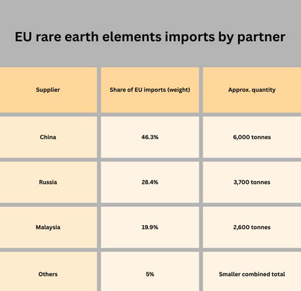 Rare earth elements (REEs) are very important for making permanent magnets that are used in electric vehicle motors, wind turbines, robots, industrial automation, and many other military technologies. According to a recent analysis from Eurostat, a small number of partners account for most of Europe's rare earth imports.