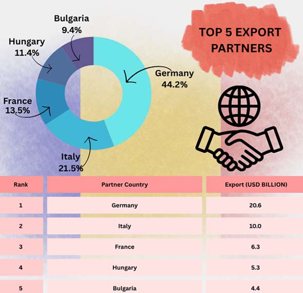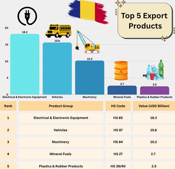 Romania's exports show that the country has a modern, industrialized economy that is closely linked to Europe's supply chains. Germany, Italy, France, Hungary, and Bulgaria are the main places where the commodities travel. Most of the mix is made up of electronics, cars, and machines. The economy is doing well because there is a lot of demand and the EU is getting more connected. However, the economy and industry in other parts of the world are still open to change.
