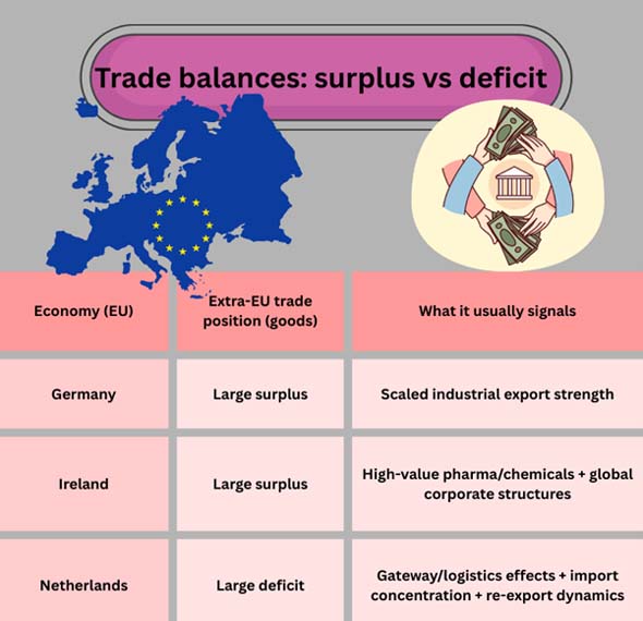 People commonly get trade balances wrong. A surplus can mean that a country is good at exporting goods, while a deficit can mean that the country is a logistical hub or an import gateway (for example, big import flows that feed re-exports) or that people in the country are buying a lot of goods.